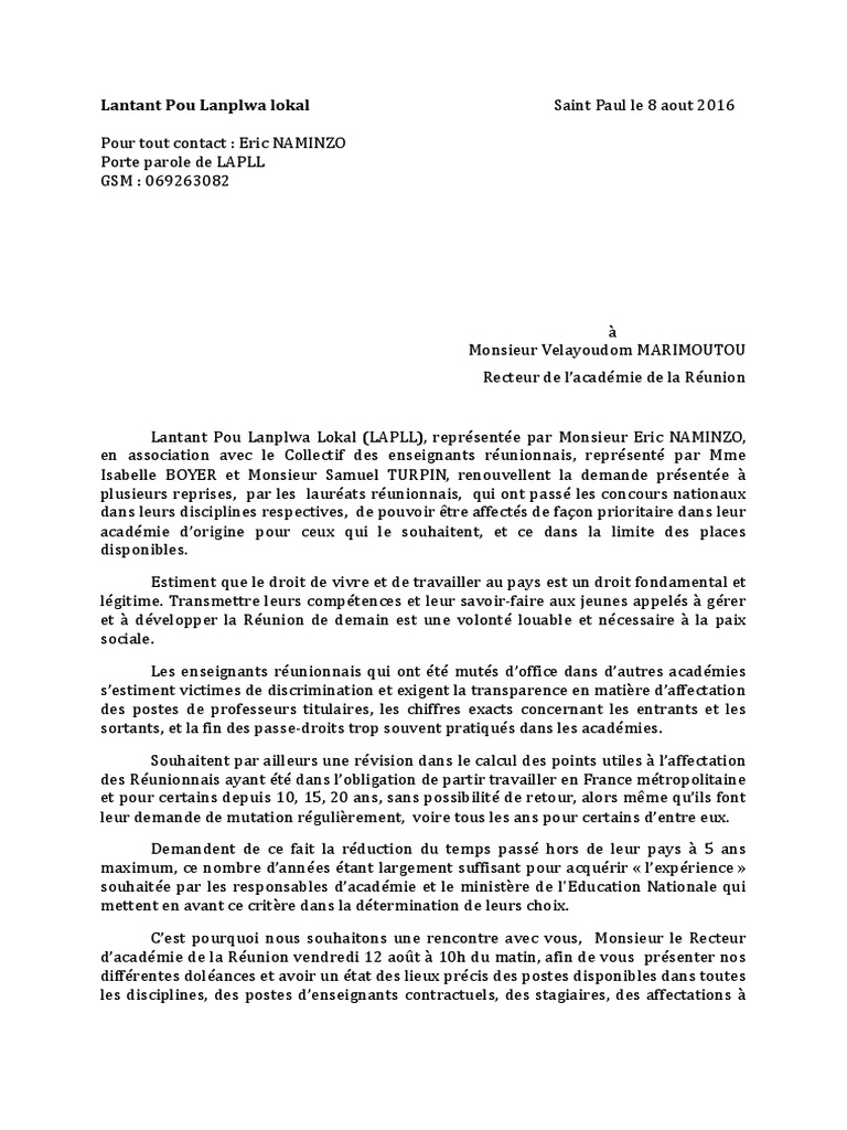 Nous vous demandons, monsieur l'inspecteur d'académie, monsieur le recteur, d'intervenir pour que ces emplois d'aide administrative soient maintenus et pérennisés car nous considérons. Convocation ( 1 ) cette autorisation est demandée dans le cadre de l’exercice du droit syndical. J'ai l'honneur de vous écrire pour vous dire combien un professeur de lettres qui a consacré une grande partie de sa vie à son métier,. Et venant de personnes sous l'autorité du recteur (dans le cas d'un courrier au recteur) le faire en formant. Réclamation d'une note obtenue au baccalauréat. Suite à la publication des résultats d'examen le (date de.